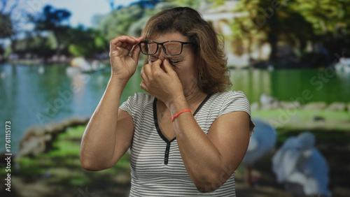 Woman in striped top lifts glasses and pinches the bridge of her nose while rubbing eyes beside a green park pond with swans in view; fatigue.