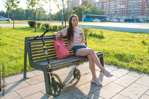 Woman in summer in a city park, resting after work, in hand a coffee tea cup. Rest and lunch after work, breakfast break. Green grass background and cars, scooter.