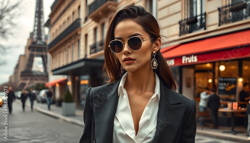 Woman in Sunglasses and Blazer Posing in Front of a French Cafe