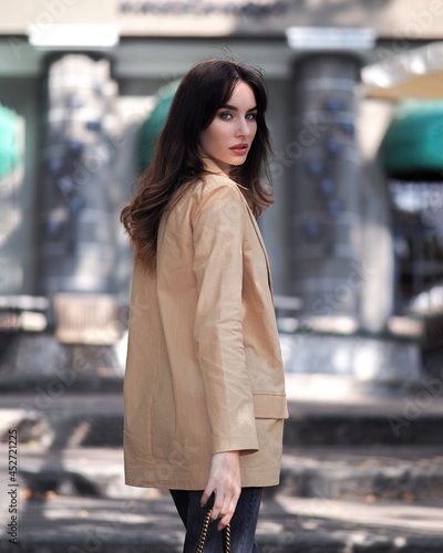 Woman in the shade on the steps in a jacket and jeans with a handbag