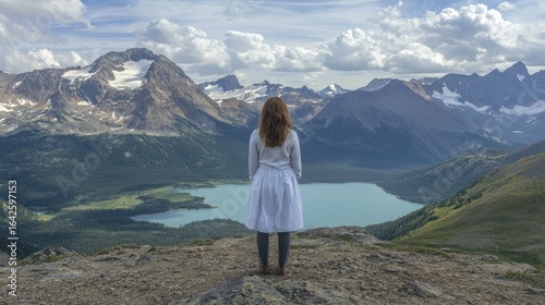 Woman in white dress standing on mountain peak overlooking alpine lake