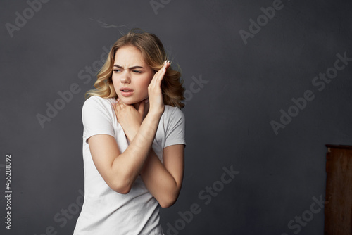 woman in white t-shirt fashion emotions studio dark background