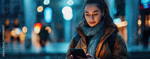 Woman in winter attire using her phone on a busy, illuminated city street at night.