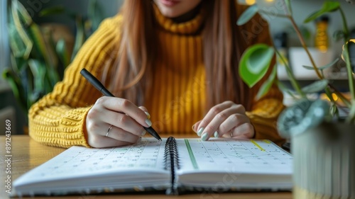 Woman in yellow sweater writing in notebook at wooden table with green plants. Focus on hands and pen, blurred background.