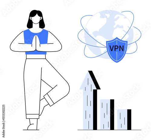 Woman in yoga pose, secure VPN shield over globe, arrow-topped bar graph rising. Ideal for cybersecurity, data protection, personal growth, mindfulness, business success, progress simple landing