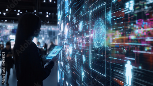woman interacts with futuristic digital interface, surrounded by vibrant data visuals and technology. scene conveys innovation and connectivity