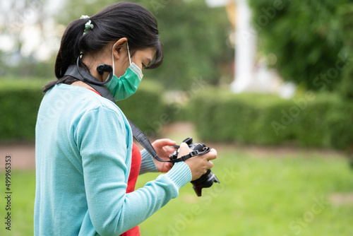 Woman is a professional photographer with camera, outdoor and sunlight, Portrait, copy space.Beautiful woman taking picture outdoors