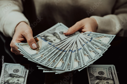 Woman is counting cash money - salary or other income. Close-up of hands with banknotes