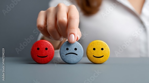 Woman is holding three smiley faces and a frowning face. The frowning face is on the left, the middle one is yellow, and the right one is red