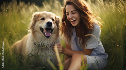 Woman is laughing with dog on grass
