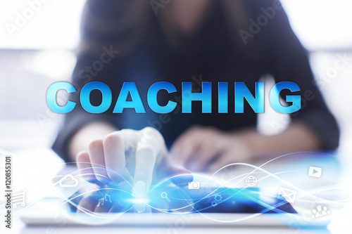 Woman is using modern tablet pc, presssing on touch screen and selecting "Coaching".