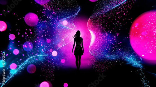 Woman is walking into a mysterious portal of light and energy, creating a captivating and futuristic atmosphere