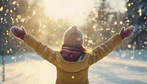 Woman Joyfully Embraces Winter Snow And Sunshine