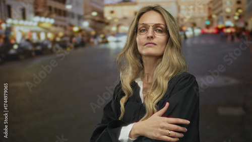 Woman judge in uniform with blonde hair standing confidently outdoors on a busy urban street with shops in background.