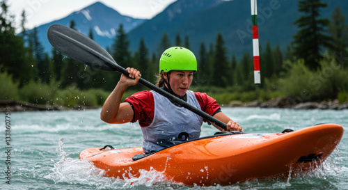Woman Kayaking Whitewater Slalom Course, Mountain Backdrop