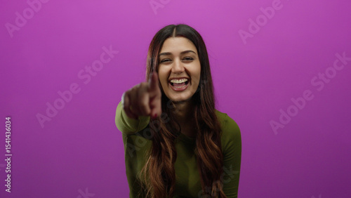 Woman laughing and pointing on isolated pink background, showcasing youthful joy and playful expression, highlighting hispanic identity and vibrant atmosphere.