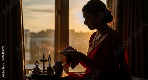 Woman lighting diyas during Diwali, Hindu festival of lights. Celebrating tradition, faith, family. Use for festive greeting cards, cultural events, travel ads.