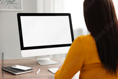 Woman looking at monitor with blank screen at wooden table indoors. Mockup for design