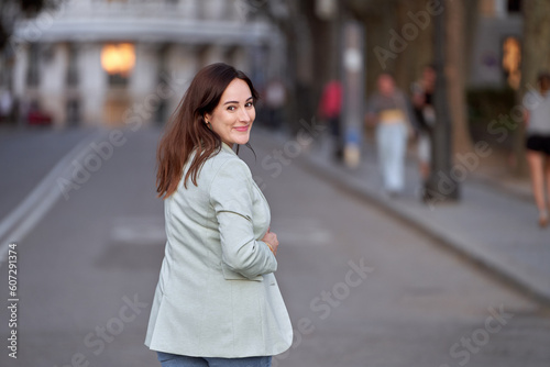 Woman looking back to camera and smiling while walking outdoors on the street.