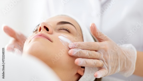 Woman lying down with eyes closed, receiving a professional facial skincare treatment from a cosmetologist, who is carefully applying a white cream to her cheek