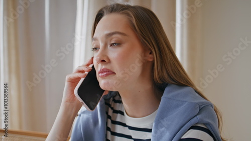 Woman manager communicating cell phone at workplace closeup. Freelancer talking
