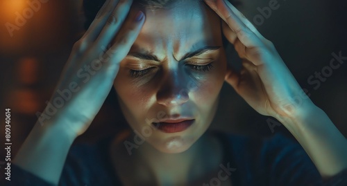 Woman massaging her temples due to a headache, dark backdrop, soft lighting emphasizing her tension and discomfort