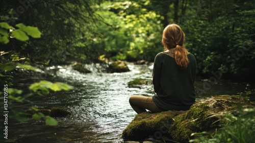 Woman meditating by a flowing creek in forest. Possible use stock photo for nature, relaxation, or mindfulness