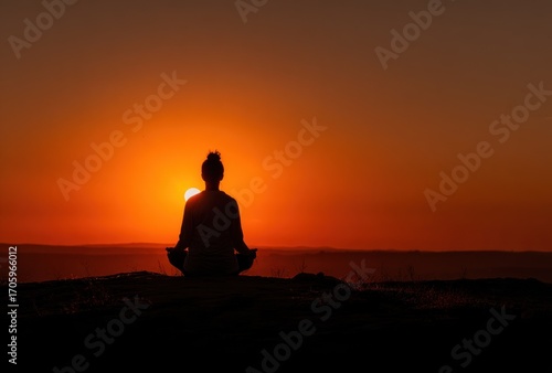 Woman meditating in lotus position at sunset. Silhouette against fiery sky, promoting peacefulness. Tranquil, solitary. Sun behind
