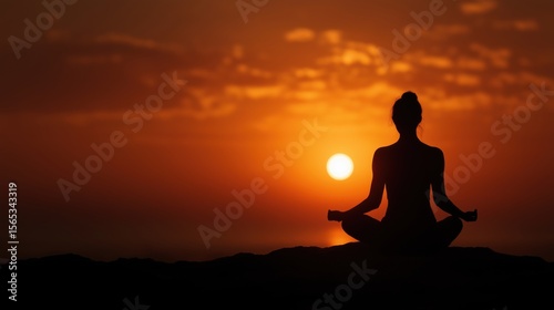 Woman meditating in serene lotus pose against vibrant orange sunset sky backdrop