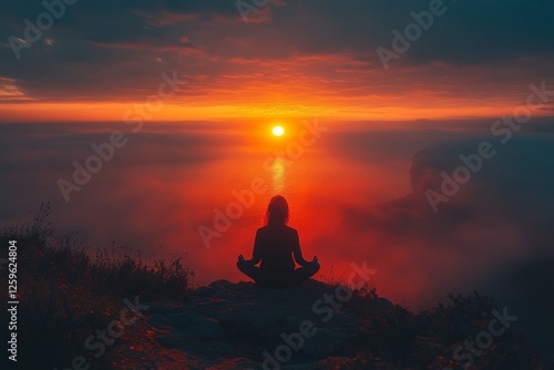 Woman meditating sunrise mountaintop fog