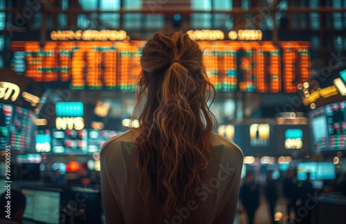 Woman monitoring digital screen displaying fluctuating stock prices with focused attention and analysis