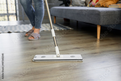 Woman mopping, wiping sleek hardwood floor in modern home setting. Housewife use cleaning mop in cozy living house room. Housekeeping, housework. Sanitation, cleanliness, hygiene, cleanup, maintenance