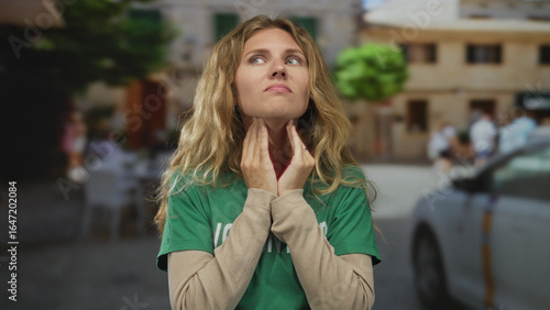 Woman neck touching on a busy street embodies a blonde young city vibe outdoor with casual focus.