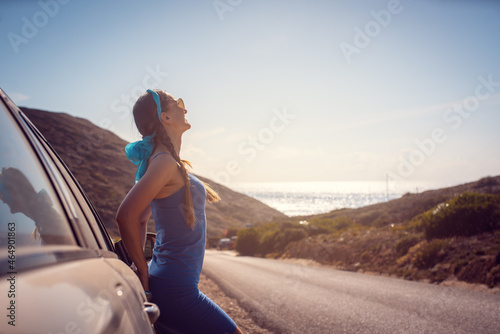 Woman on a road trip arriving with her car by the sea enjoying freedom