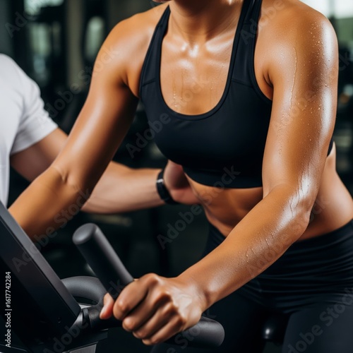 Woman on exercise bike at gym. Woman on exercise bike with trainer at gym