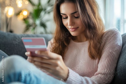 Woman Online Shopping Credit Card Cozy Home Sweater Girl Happy Retail Female Indoor Payment Smiling