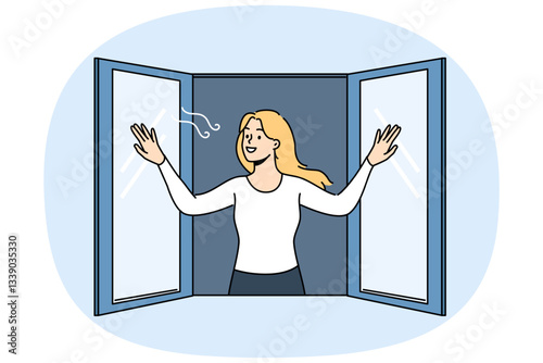 Woman opens window enjoying fresh air coming from street into apartment, and smilingly looks at passers-by. Girl stands near window and wants to check room to get rid of unpleasant smell in house.