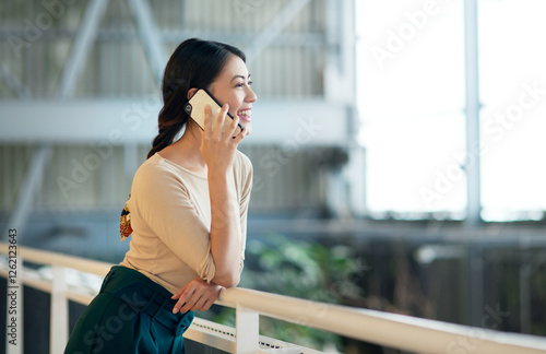 Woman, outdoor phone call and talking to client, copywriter journalism and creative article. News, quote column and editing story for development on office balcony, planning and discuss project