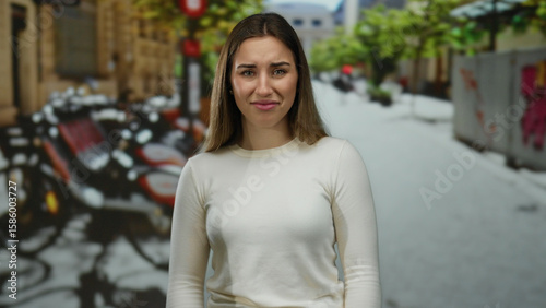 Woman outdoors on a street with blonde hair and neutral expression, white shirt, and blurred city background featuring motorbikes and greenery.