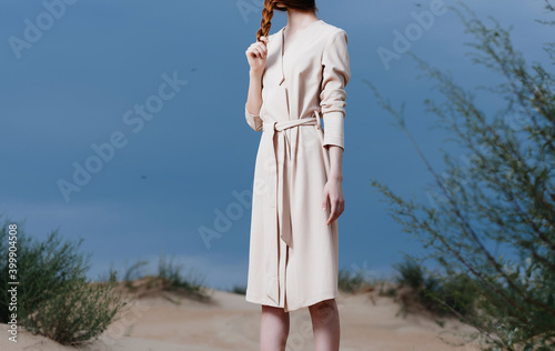 woman outdoors sand green bushes landscape destination