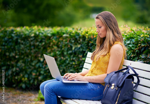 Woman, park and typing on laptop as university student with assignment or essay in New York. Female person, elearning and break in garden with online research on website for college task or project