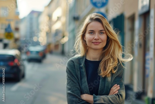 Woman Path. Blond Woman Standing with Arms Crossed on Street, Smiling with Copy Space