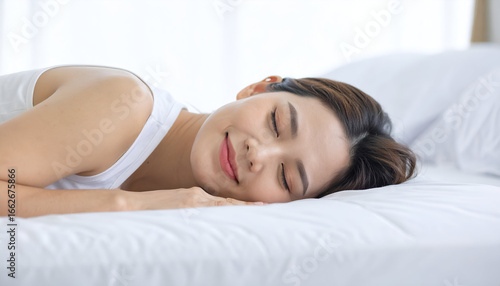 Woman peacefully dozing off on a mattress, side sleeping position, bright clean background.