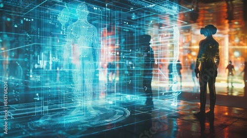 Woman people wears a VR goggles augmented reality device headset. Hologram screen technology background.
