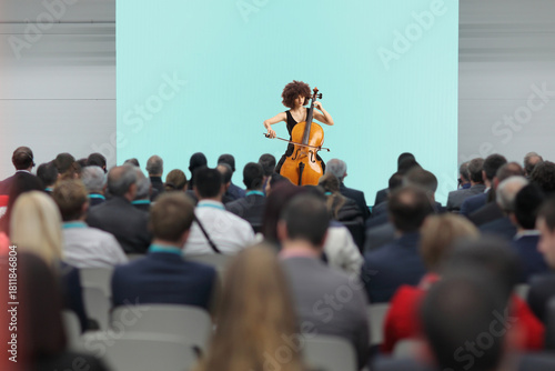 Woman playing a cello in front of audience