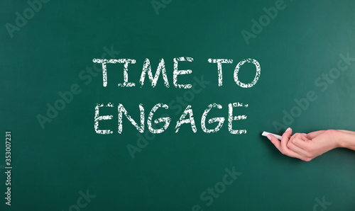 Woman pointing at chalkboard with text Time To Engage, closeup