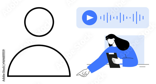 Woman pointing while holding a tablet, next to an audio waveform and playback button. Ideal for technology, audio content, digital tools, streaming, modern work, communication, simple landing page