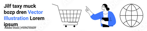 Woman pointing while holding clipboard, shopping cart symbolizing shopping, globe symbolizing globalization and world connectivity. Ideal for e-commerce, global trade, business presentations, online