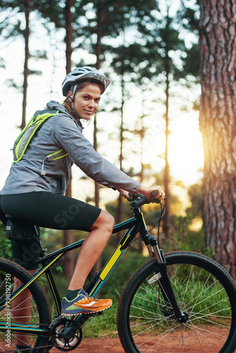 Woman, portrait and forest on bicycle for adventure travel, fitness and wellness for competition. Athlete, mountain bike and cycling for workout, training and exercise with practice for marathon