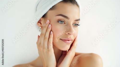 Woman Portrait with Clear Skincare in Studio. Healthy Beauty and Hands Touching Smooth Skin on White Background